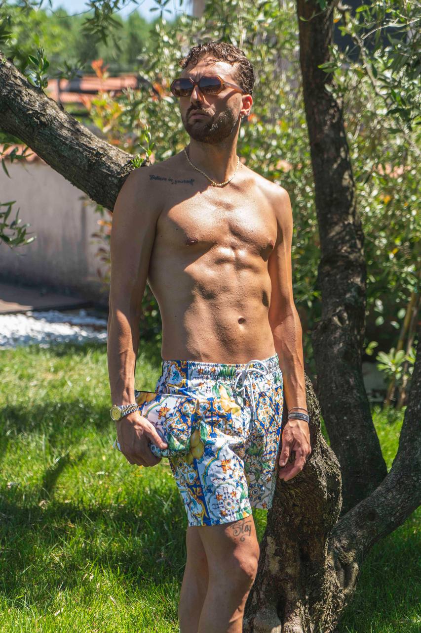 Cogli l'estate al volo con il nostro costume modello boxer ispirato alla tipica maiolica caprese e ai limoni del Mediterraneo! Grazie alla sua massima leggerezza, si asciuga subito per darti il massimo comfort in spiaggia o in piscina. Acquistalo ora e fai il matching con tuo figlio!