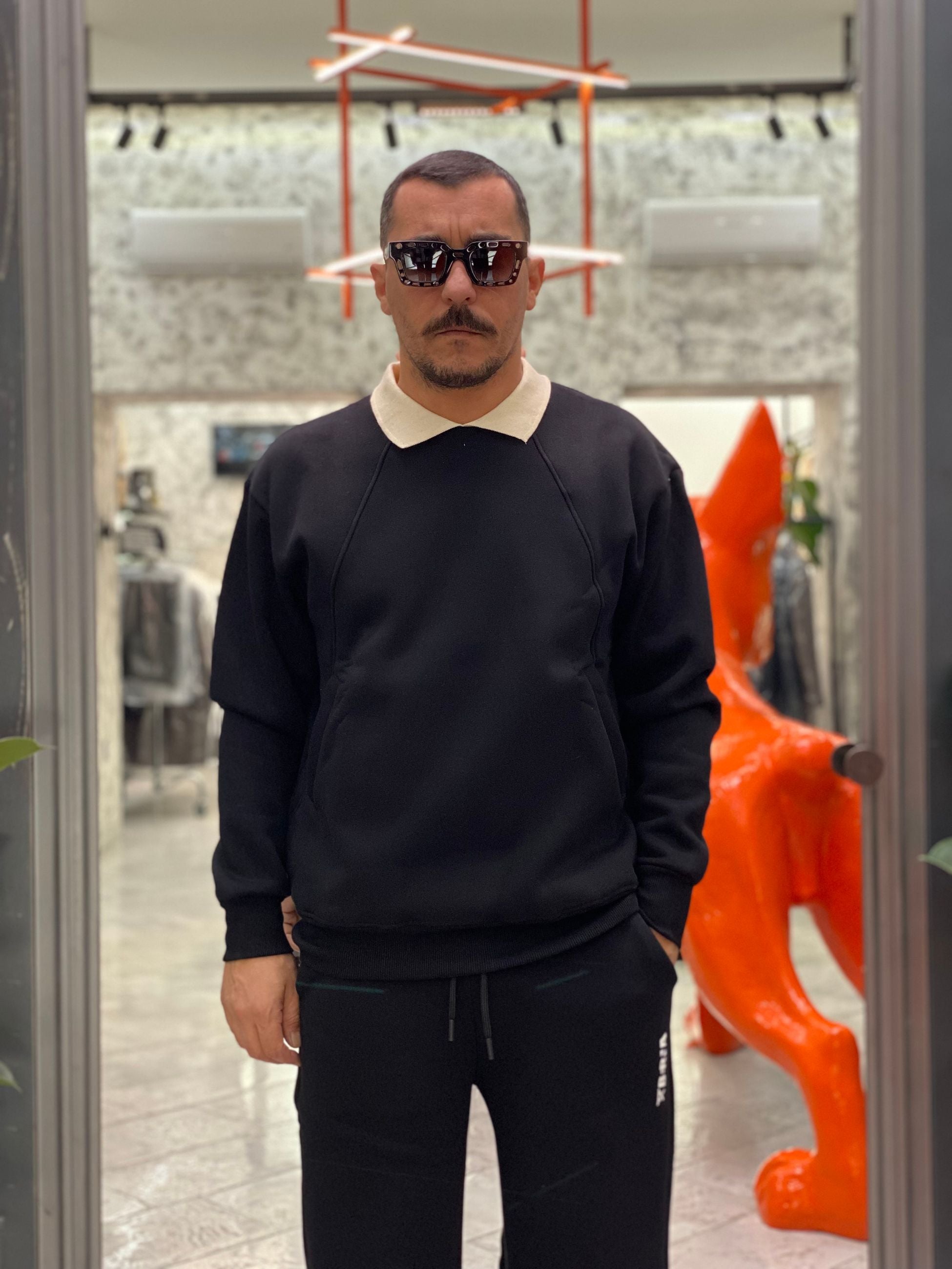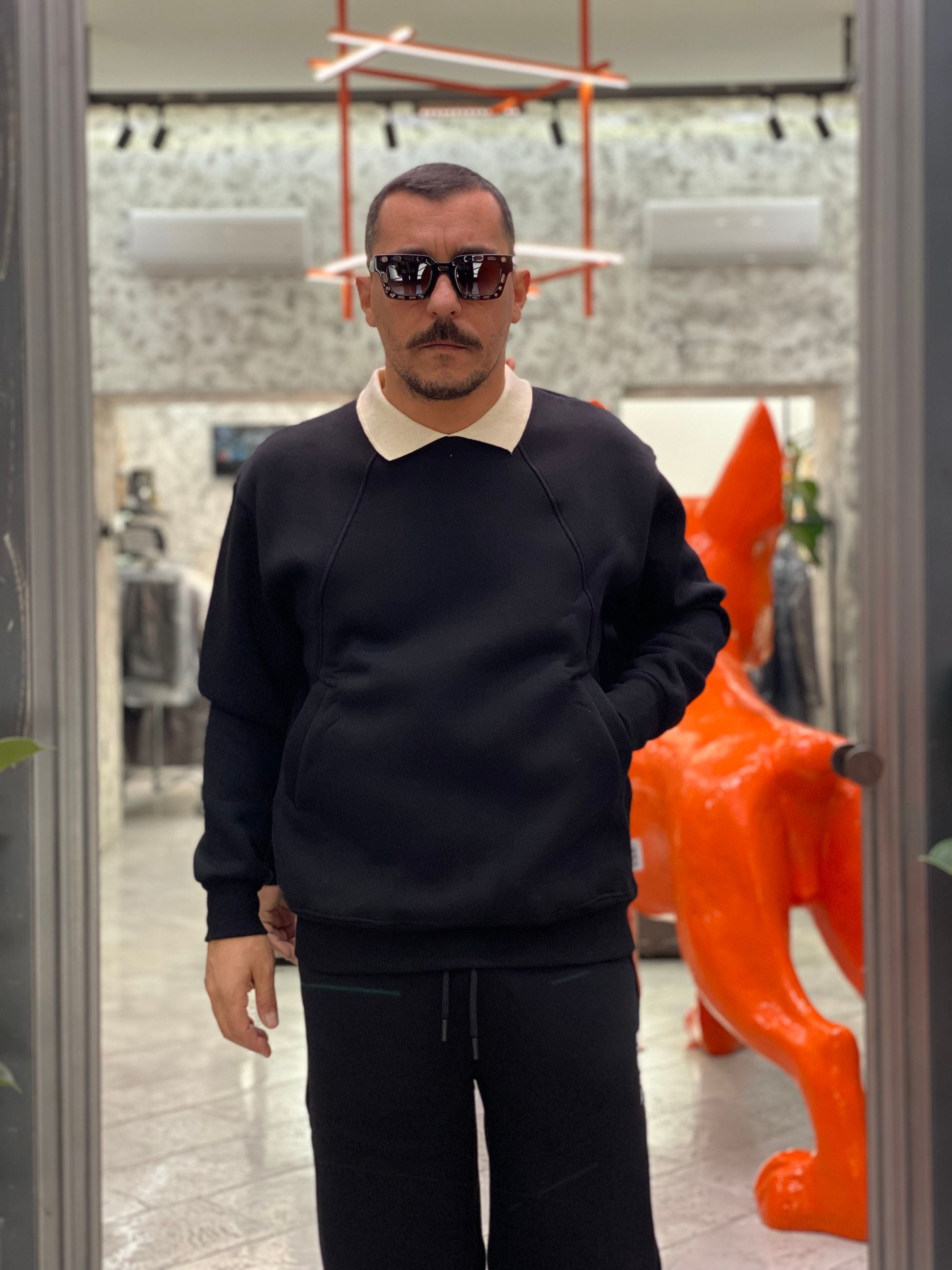 Felpa girocollo manica lunga in misto cotone con colletto applicato a contrasto.