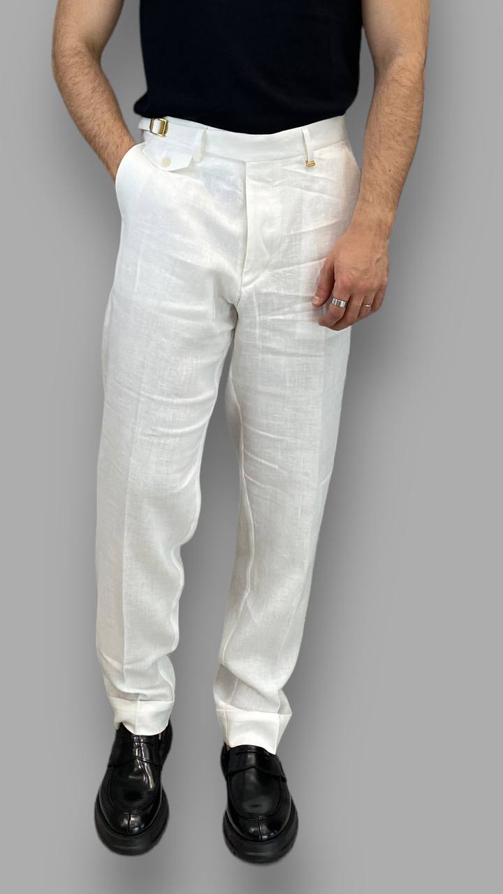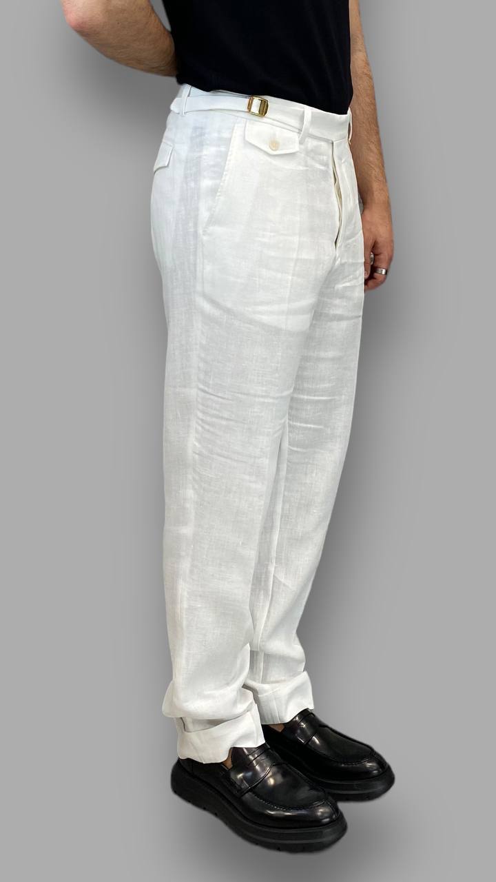 PANTALONE DA ABITO IN 100%LINO TASCA AMERICA GAMBA AMPIA CON RISVOLTO - RELAXED FIT