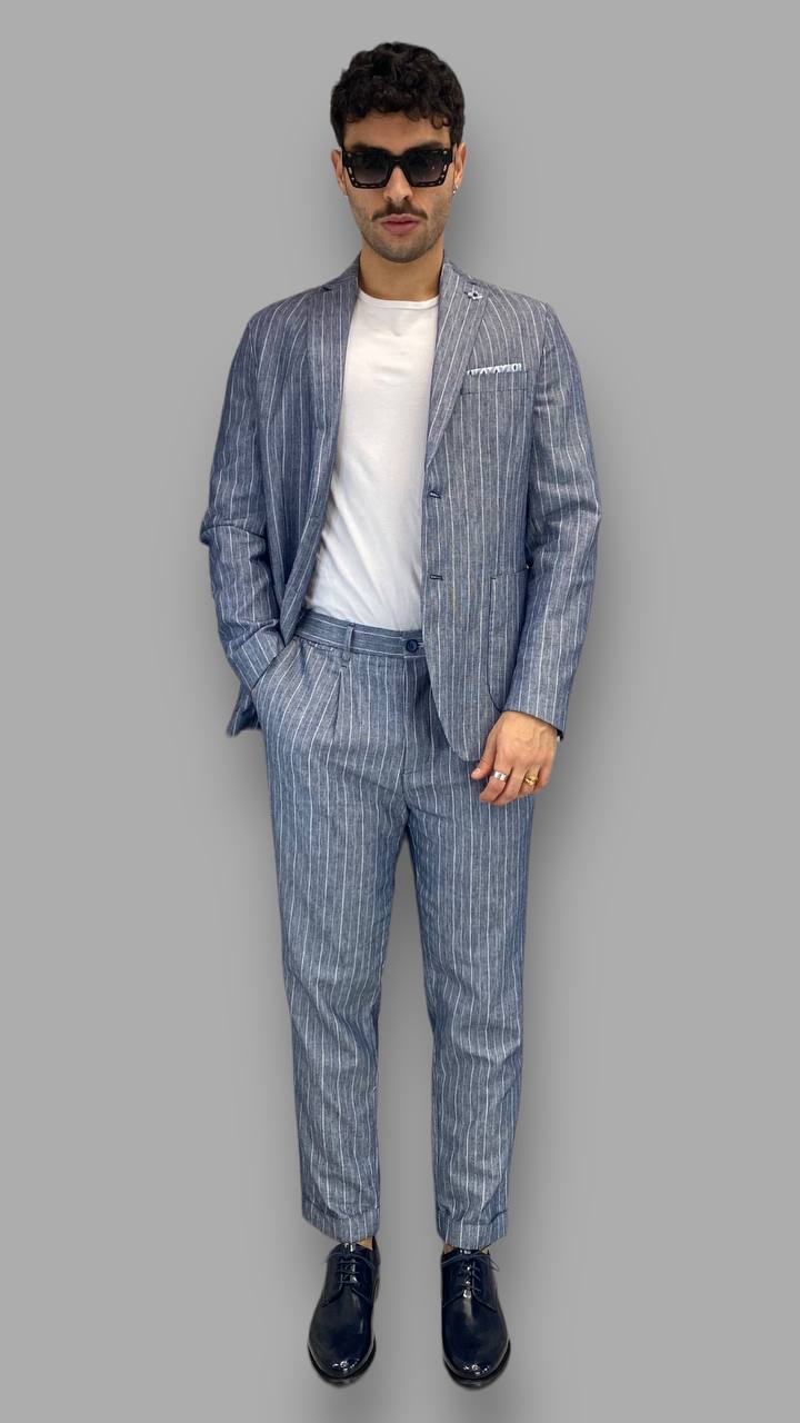 Questo pantalone gessato da abito in misto lino ti offre il massimo comfort e leggerezza grazie al suo design regolare e alla coulisse in vita. Perfetto per i tuoi eventi, può essere acquistato insieme alla sua giacca per un abbinamento impeccabile. Il modello indossa la taglia 50 ed è alto 1,82m per 81kg.
